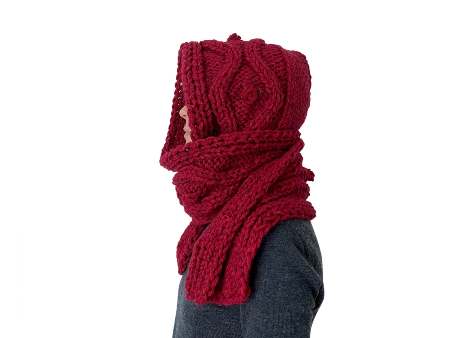 Wool Hooded scarf was knitted by my mom. Chunky wool scarf with hood combination will keep you toasty and warm through the cold months.