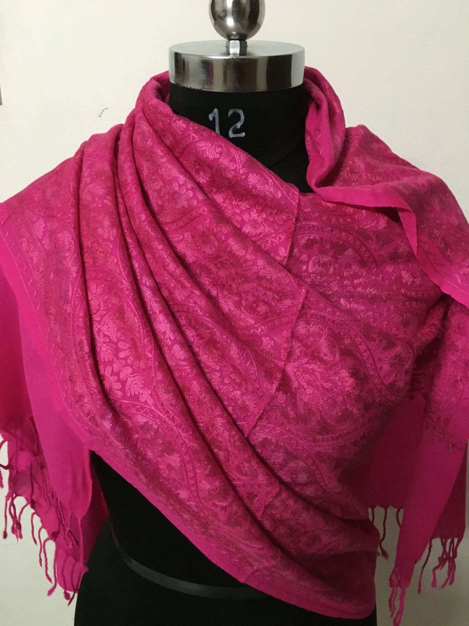 We are manufacturer elegant, affordable ,luxurious Kashmir shawl|wrap|scarf| scarves in multicolor and one color and many patterns in jam war design, kani disign,self design,jacard silk shawls ,and plain shawls and scarves with pashmina and silk .this is very light weight you put in your pocket.