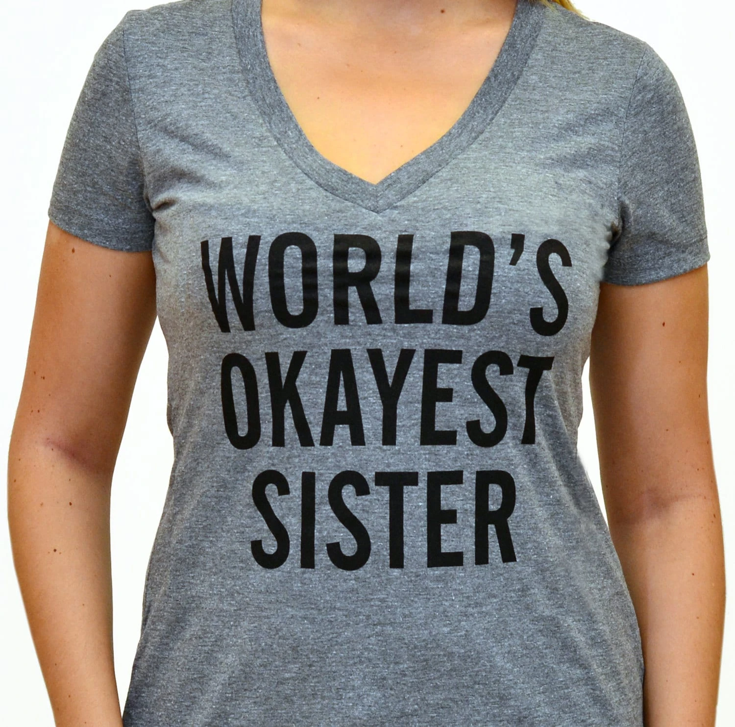 World’s Okayest Sister T-shirt. Comfortable and feminine v-neck features a flattering, fashionable look. Super soft and light weight triblend fabric