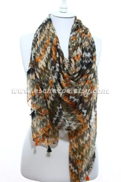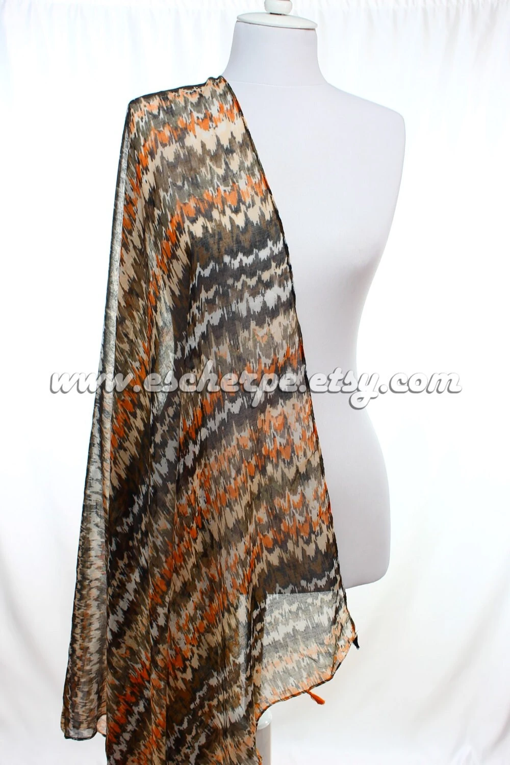 Orange, Brown, Beige, Black, White Zig zag patterned oversize scarf.